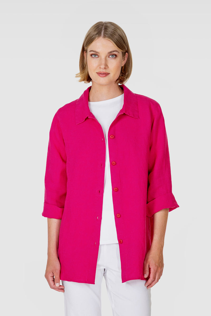 Pinkki ARNIKKI-paita on valmistettu laadukkaasta ja kauniisti laskeutuvasta pellavasta. Paitaa voi käyttää myös kevyenä jakkuna. Siinä on paitakaulus, nappikiinnitys sekä pyöristetty helma. Kyynärpäiden yli ulottuvissa hihoissa on halkiot ja leveät käänteet, joiden avulla hihoja voi kääntää lyhyemmiksi. Vaate on tuotepesty, joten se ei kutistu ja tuntuu miellyttävän pehmeältä päällä. ARNIKKI-paita on suunniteltu Suomessa ja valmistettu Liettuassa.