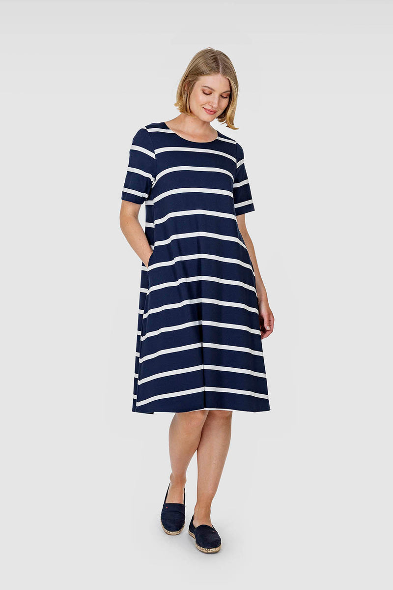 Merihenkinen KEITELE-mekko on valmistettu sini-valkoraitaisesta viskoosineuloksesta, jossa on hieman elastaania joustoa antamassa. Vaatteen materiaali tuntuu erittäin miellyttävältä ihoa vasten. Lyhythihaisessa mekossa on siro hartialinja, pyöreä pääntie ja alaspäin levenevä helma sekä taskut sivusaumoissa. KEITELE-mekko on suunniteltu Suomessa ja valmistettu Liettuassa.