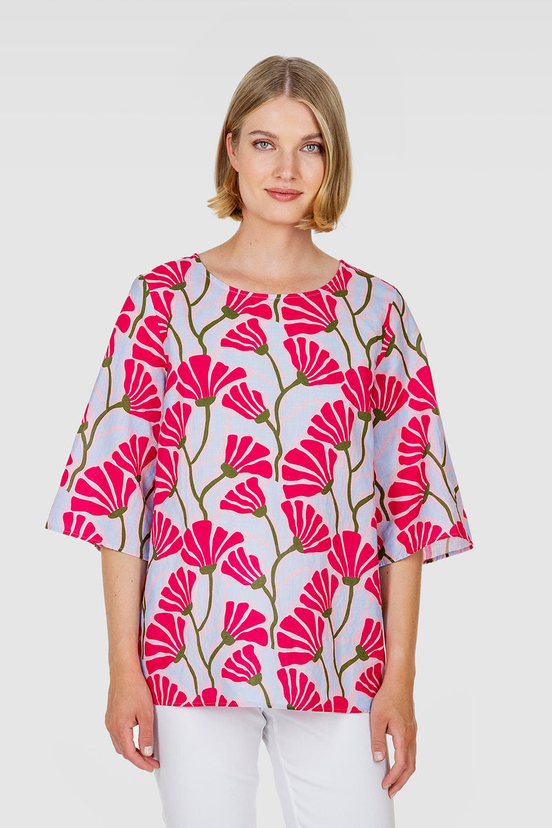 Kesäinen KISSANKELLO-paita on siro hartioista ja levenee helmaan. Paidassa on kyynärpäihin ulottuvat hihat, pyöreä pääntie sekä kaareva helma. Se on valmistettu laadukkaasta ja kauniisti laskeutuvasta painetusta pellava-puuvillakankaasta, kuosina tyylitellyt pinkit kukat. Vaate on tuotepesty, joten se ei kutistu ja tuntuu miellyttävän pehmeältä päällä. KISSANKELLO-paita on suunniteltu Suomessa ja valmistettu Liettuassa.