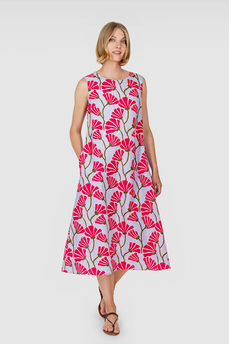 Kesäisen juhlavassa KURJENPOLVI-mekossa kukkivat pinkit kukat. Hihaton, pitkä mekko on siro hartioista ja levenee kevyesti helmaan, siinä on taskut sivusaumoissa. Mekko on valmistettu laadukkaasta ja kauniisti laskeutuvasta painetusta pellava-puuvillakankaasta. Vaate on tuotepesty, joten se ei kutistu ja tuntuu miellyttävän pehmeältä päällä. KURJENPOLVI-mekko on suunniteltu Suomessa ja valmistettu Liettuassa.