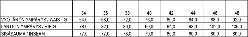 Kapealinjaiset housut.<br>Malli on 177 cm pitkä ja hänellä on päällä koko 36, jonka sisäsauman pituus on 77 cm ja vyötärönympärys venyttämättä 68 cm.