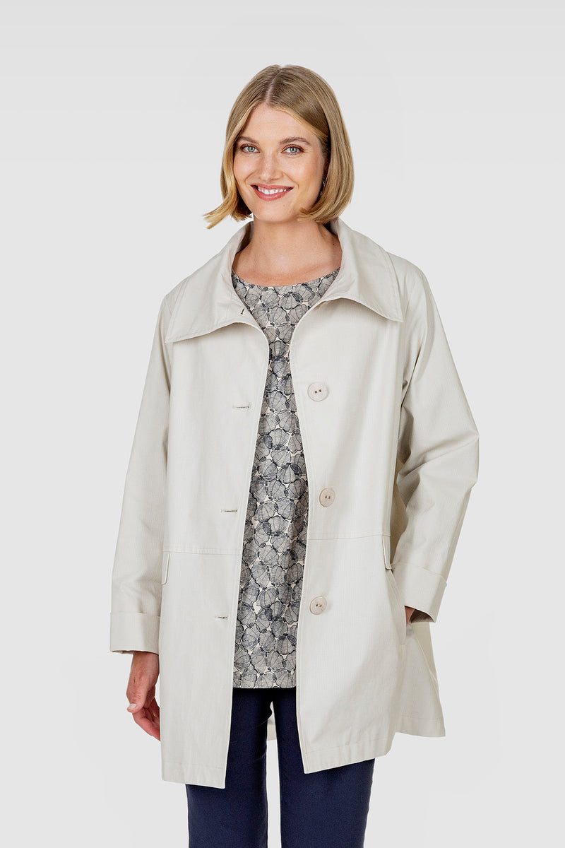Rento ja ajaton NUOTTI-takki on valmistettu laadukkaasta beigenvärisestä puuvillakankaasta, jossa on hieman elastaania joustoa antamassa. Kankaan pinnassa on hento kudottu ruutustruktuuri. Takissa on reilu paitakaulus, nappikiinnitys sekä taskut etukappaleen pystysaumoissa ja taskujen päällä taskuläpät. Hieman alaspäin levenevässä ja melko väljälinjaisessa takissa on laskettu olka ja hihoissa on leveät käänteet, joilla hihojen pituutta voi muunnella. Takakappaleella on kaarroke. Takki on vuorillinen. NUOTTI-takki on suunniteltu Suomessa ja valmistettu Liettuassa.