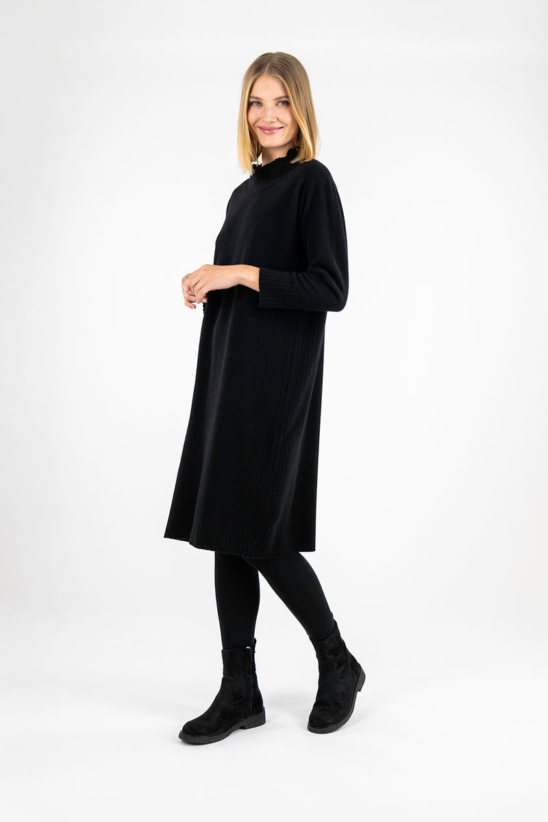 Suoralinjainen TORPPA-neulemekko on ihanan pehmeän tuntuinen, kevyt ja lämmin. Musta neulemekko on neulottu laadukkaasta villa-kashmirlangasta. Sivuissa, pyöreällä pääntiellä, hihansuissa sekä helmassa on ribbineulosta. Olkasauma on laskettu. TORPPA-neulemekko on suunniteltu Suomessa ja valmistettu Liettuassa.