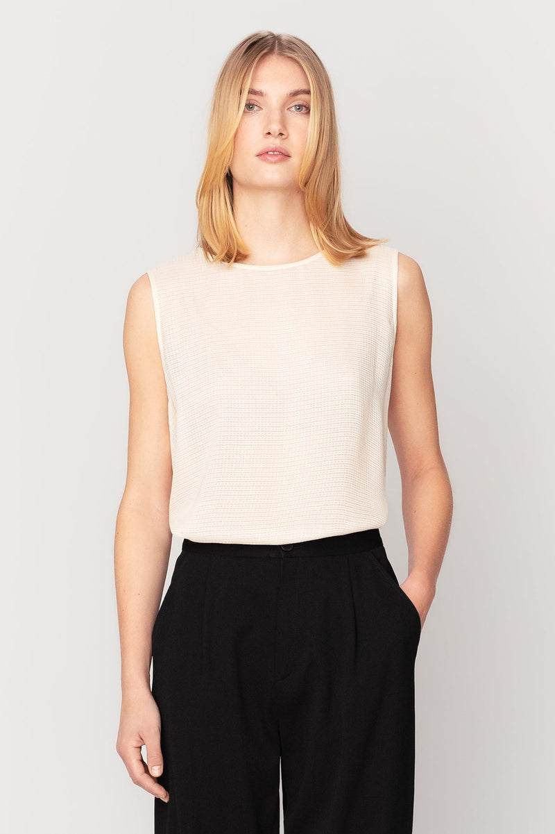 Ohut, kermanvalkoinen hihaton UTU-paita on valmistettu struktuuripintaisesta läpikuultavasta viskoosikankaasta. UTU-paita harteista siro, mutta levenee hieman helmaan, jossa on halkiot. UTU-paita on suunniteltu Suomessa ja valmistettu Liettuassa.